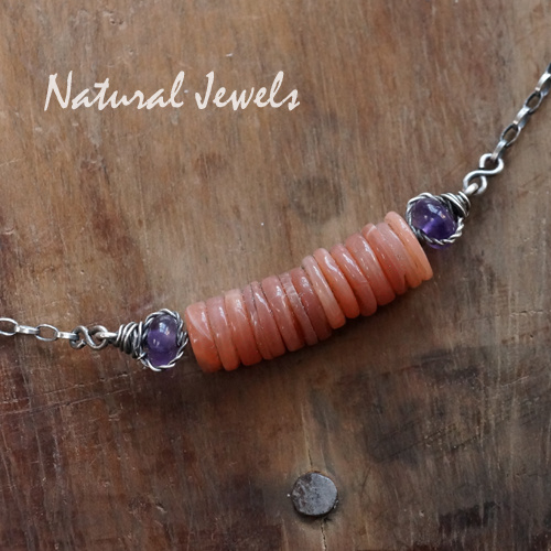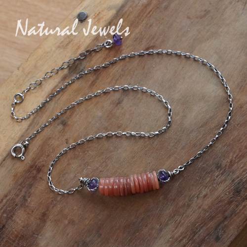 Een zilveren halsketting met een schakel met schijfjes van perzikkleurige Maansteen met aan weerszijden een Ametist, die in een koordje van zilver is gevangen. De halsketting sluit op 45 cm en heeft een verlengstukje van nog 5 cm.