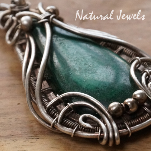 Voor alles is een eerste keer en dit is dan de eerste keer dat ik niet goed weet met welke soort edelsteen ik heb gewerkt. Volgens de papieren zou het Malachiet moeten zijn, en dat zou natuurlijk heel goed kunnen. Maar ik ga twijfelen omdat ik op de achterkant, die niet is gepolijst, allemaal glittertjes zie en dat ken ik niet van Malachiet. Er zou een duidelijk streep-patroon moeten zijn en dat zie je maar heel vaag aan de voorkant, die overigens vrij mat is gepolijst. Eigenlijk heel mooi allemaal, er is dan ook vooral niks mis mee, en het zal best Malachiet zijn, maar ik weet het niet 100% zeker. Maar ik vond het een erg mooie steen en ik heb er een zilveren hanger van gemaakt met sierlijke lijnen van zilver, zoals ik ze zo graag maak. Het is een erg mooi hangertje geworden. Met een groene mysterieuze steen.