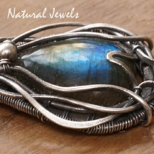 Een met de hand gemaakt hangertje van zilver met een cabuchon van Labradoriet. Het hangertje is vrij klein, in totaal met het ophangoogje erbij gerekend is het ruim 4 cm hoog. Sierlijke lijnen omgeven de prachtige steen met een flash die verloopt van blauw onderin naar goudgeel-oranje rechts bovenin. Het zilverwerk heeft een wat elfenachtige uitstraling, samen met de kleuren van de Labradoriet heeft het geheel een sprookjesachtige uitstraling.