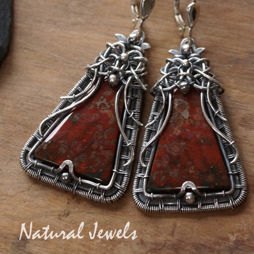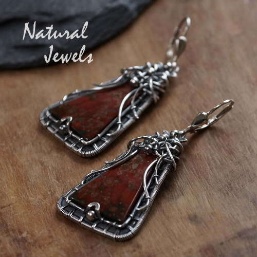 Zilveren handgemaakte oorbellen met Heliotroop Jaspis. De stenen zijn cabuchon geslepen en hebben hoeken en dat is wel even heel stuk lastiger om mee te werken dan de ronde vormen waar ik normaal mee werk. Maar ik vond de stenen zo mooi dat ik het niet kon laten ze te kopen en het is me gelukt! De kleur is vrij donker, maar het is erg afhankelijk van het licht, soms zijn ze roodbruin, soms zijn ze donkerrood. Er zit wat donkergroens in en ik ontwaar wat okergele plekjes. De steen zit veilig opgesloten in een geweven frame met een toef zilveren krullen aan de bovenkant. Alles hangt aan een veilige klaphaak. Opvallende zilveren oorbellen met een stevige en antieke uitstraling.