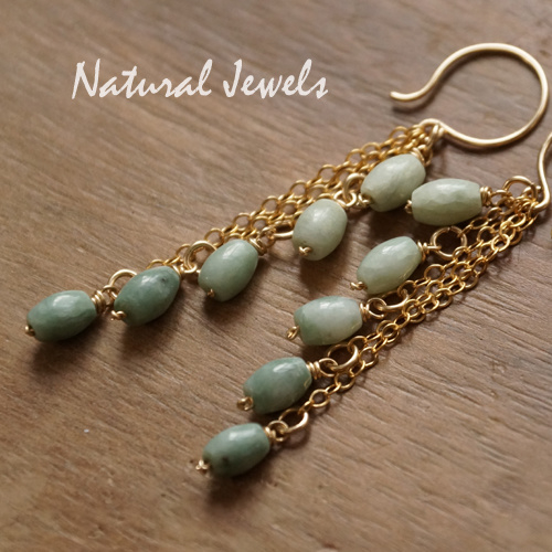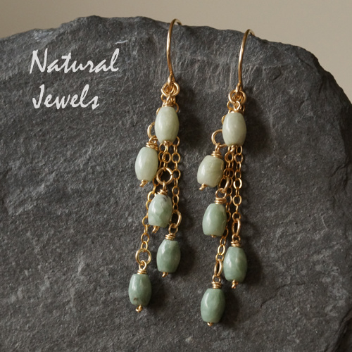 Oorbellen van 14K Goldfill met ovale kraaltjes van Jadeiet. Deze ovaaltjes zijn vrij lichtgroen van kleur, en ik heb ervoor gekozen bovenin de lichtste te hangen, waarbij de kleur van de kraaltjes die lager hangen steeds ietsje donkerder wordt. Ieder kraaltje hangt aan z'n eigen stukje schakelketting. Vrolijke en lichte luchtige oorbellen, lekker speels.