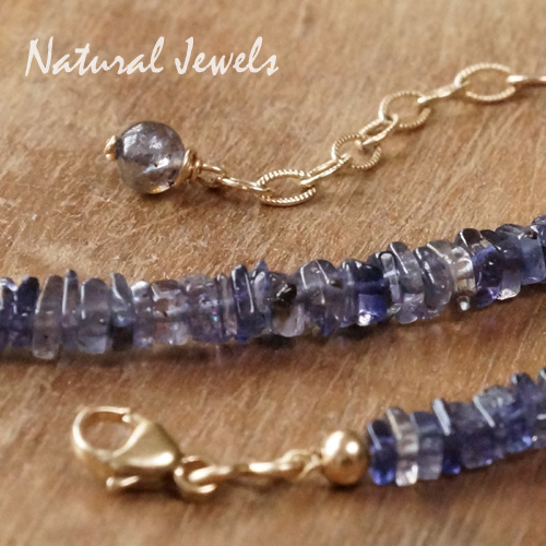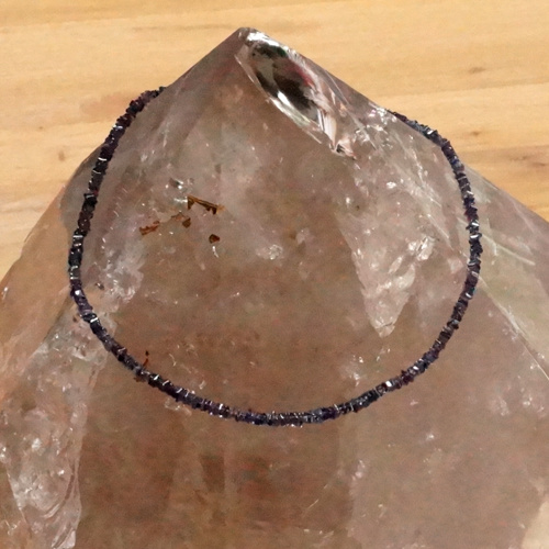 Een halsketting van 14K Goldfill met kraaltjes van Ioliet. De vorm van de kraaltjes wordt heishi genoemd, vierkantje schijfjes, en in dit geval allemaal anders van vorm, dikte en tint. Die verscheidenheid geeft de halsketting een prachtige levendige en natuurlijke uitstraling. Ioliet heeft een bijzondere blauwe kleur die ik moeilijk kan omschrijven, maar de foto's zeggen genoeg. De steen is transparant, maar kan op een donkere ondergrond ook vrij donker overkomen. De schijfjes zijn heel klein, ongeveer 3 mm en de dikte is over het algemeen minder dan 1 mm. Het was dan ook een hele klus om dit snoer te rijgen.Het resultaat mag er zijn, door al die kleine schijfjes wordt het licht prachtig gereflecteerd. Een erg mooie halsketting.