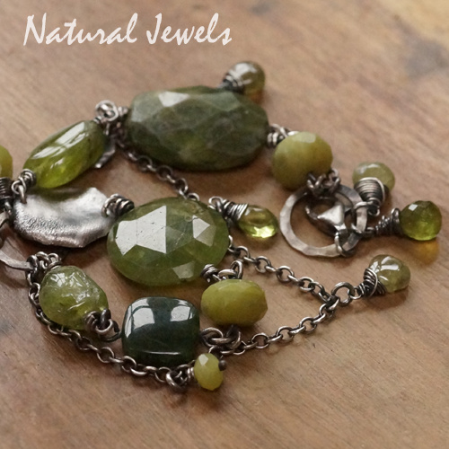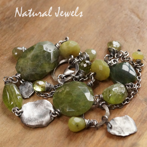 Een zilveren handgemaakte armband met edelstenen in een warme groene tint. De grote muntvorm valt het meeste op, het is een Vessoniet. De andere grote is een free-form en dat is een groene Granaat. Beide stenen zijn facetgeslepen. De transparante groene free-form kralen zijn van Peridot, de vierkante vorm is Jade. En de twee lichtgroene rondellen zijn Olijfjade, ook facetgeslepen. Verder zijn er kleine brioletjes die aan de gehamerde zilveren cirkels hangen en aan het kettinkje, het zijn ook Peridot, Vessoniet en Olijfjade. En natuurlijk ontbreken de zilveren elementen niet, die heb ik prachtig oud gemaakt, zodat de armband de uitstraling krijgt waar ik zo van hou. Al met al is er weer heel veel om naar te kijken, om te dragen en te koesteren.