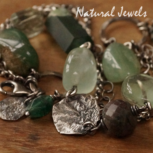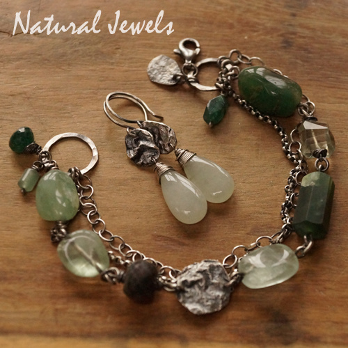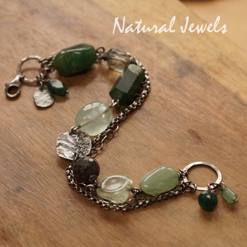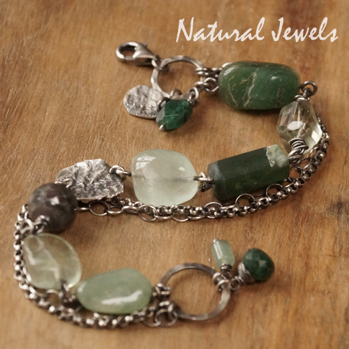 Een met de hand gemaakte robuuste armband van Sterling zilver met groene edelstenen. En ik moet eerlijk bekennen dat ik niet van alle stenen de naam weet. Normaal gesproken koop ik per snoer in en dan staat uiteraard erbij wat voor steen het is. Maar in deze armband zitten een paar stenen die ik al vele jaren heb en ik weet niet meer hoe ik eraan ben gekomen. Ze zijn van vóór de tijd dat ik met Natural Jewels begon. Maar inmiddels is dat al ruim 11 jaar geleden en ik denk dat ik wel redelijk goed ben in het determineren van stenen. Dus daar gaan we, aan de hand van de eerste foto. Linksboven de grote is Aventurein, dan een groene Ametist, een Serpentijn, Fluoriet, een gereticuleerde zilveren munt, Smaragd, Fluoriet en Aventurein. De kleine steentjes die aan de cirkels hangen zijn alle drie Aventurein, maar zoals je ziet heel verschillend van kleur. Verder heeft de armband nog 2 strengen van verschillende zilveren schakels. De armband is 21 cm. lang, dat lijkt heel lang, maar omdat de stenen erg groot zijn heb je dat al snel nodig. Op de laatste foto ligt er een paar oorbellen van Jade bij, wat perfect past bij deze armband.