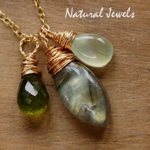 Een setje van 3 hangers in 14K Goldfill. In het midden een Labradoriet met een goudgroene glans. Er zijn wat donkere aderen te zien en er is een klein donker stipje. Aan de ene kant een Prehniet, dit steentje is gladgeslepen en het is semi-transparant. Aan de andere kant een facetgeslepen brioletje van de semi-transparante edelsteen Vessoniet, de kleur is heel warm groen. De kleuren en uitvoeringen van de steentjes passen erg mooi bij elkaar.