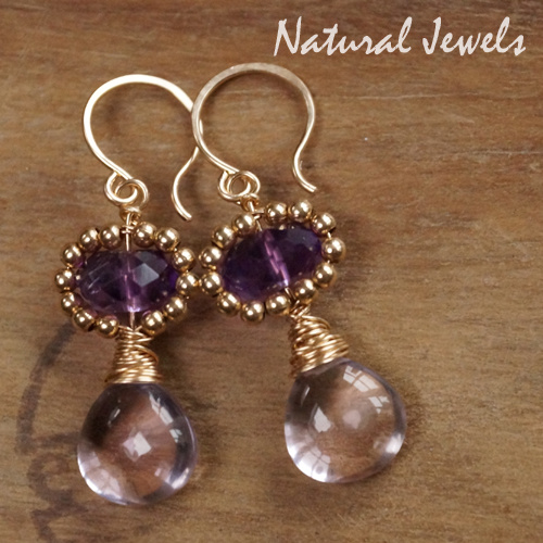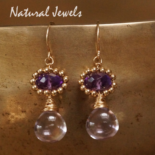 Oorbellen van 14K Goldfill met Ametist. Een facetgeslepen rondel van vrij donkere Ametist wordt ingesloten door door frame van kleine gouden balletjes, daaronder hangt een gladgepolijste briolet van lila Ametist met een heel licht tintje. Alles hangt aan een klein rond en sierlijk oorhaakje.