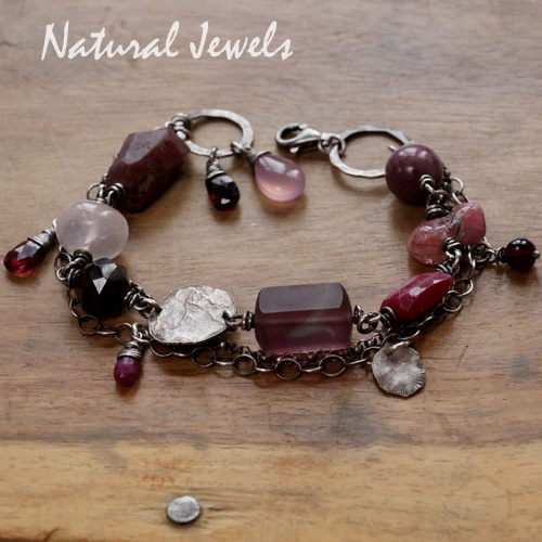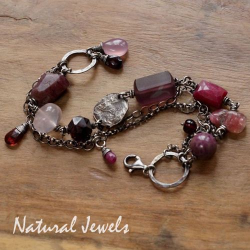 Een handgemaakte zilveren armband met edelstenen in roze en donkerrode tinten. De gebruikte edelstenen zijn Rozenkwarts, Robijn, Granaat, Fluoriet, Sugiliet, Toermalijn en Chalcedoon. Volop variatie dus, en niet alleen wat edelsteen betreft, maar ook een prachtige mix van kleuren, vormen en texturen. Ook zijn er zilveren elementen aan de armband toegevoegd, die het geheel een robuuste en doorleefde uitstraling geven. Een armband om te koesteren.