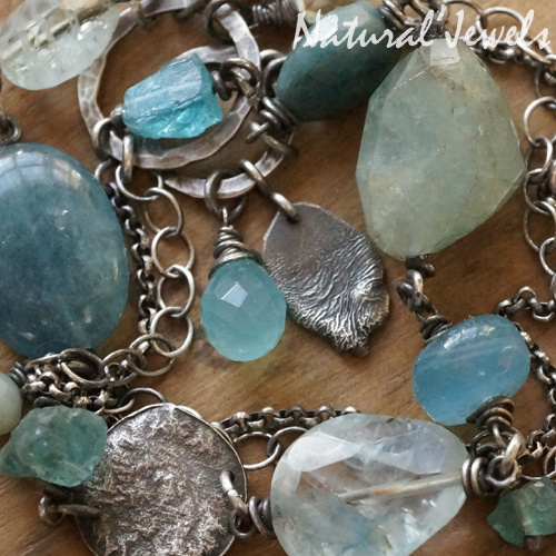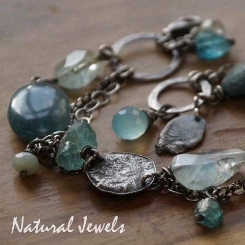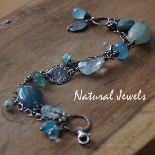 Een zilveren met de hand gemaakte armband met blauwe edelstenen. Aquamarijn, Amazoniet, Apatiet, blauwe Kwarts en blauwe Chalcedoon zijn de edelstenen die ik heb gebruikt in deze armband. Verder vind je een aantal met de hand gemaakte zilveren elementen, die nog wat karakter toevoegen aan het geheel. De blauwe tintjes combineren erg mooi met het donkere zilver. Een puur natuur armband.
