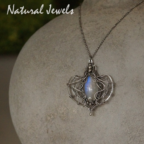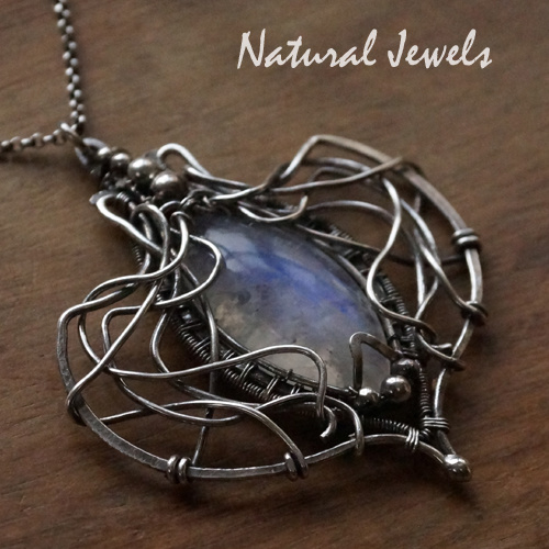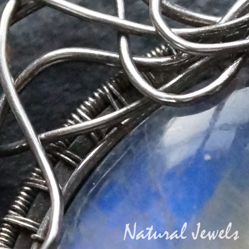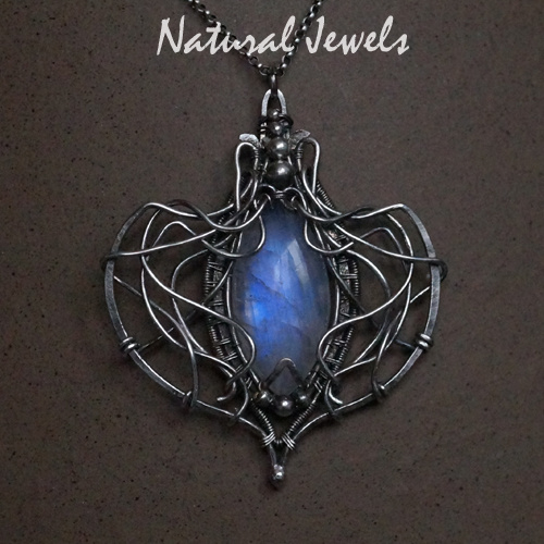 Een met de hand gemaakte zilveren hanger met een cabuchon van AAA Maansteen. De steen heeft een schitterende blauwe glans en is prachtig glad gepolijst in een marquis-vorm. Dat betekent dat de boven- en de onderkant in een puntje lopen. De kwaliteit van deze steen is zeer hoog, de glans is schitterend blauw richting indigo en zoals je op de laatste foto kunt zien is er veel transparantie. Het frame van zilver is deze keer wat breder dan normaal, ik wilde weer eens iets anders uitproberen en ik heb er geen spijt van. Het zilverwerk doet elfenachtig aan, je kunt er keltische invloeden in vinden, of uit de Jugendstil periode. Feit is, dat de hanger heel sierlijk en sprookjesachtig aandoet, mede door die zilveren lijnen die door elkaar heen spelen, maar zeker ook door de uitstraling van de Maansteen.