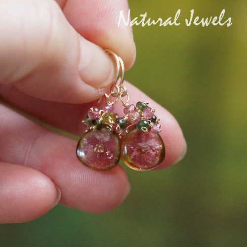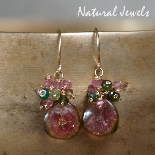 Oorbelletjes van Watermeloentoermalijn. Alleen die naam al, daar ga je toch van watertanden!! Deze schijfjes heb ik al minstens 10 jaar in mijn bezit, ingekocht toen ik net was begonnen met sieraden maken. Ze kostten een kapitaal en ik wist niet goed wat ik ermee moest doen, ze hadden iets nodig maar ik wist niet wat. Tot ik een snoertje met hele mini-kleine watermeloentoermalijntjes inkocht, en wat staan ze mooi op dat schitterende schijfje. De oorbelletjes zijn heel klein, vergis je niet, pak er even een liniaal bij of dit wel is wat je wilt, ze zijn in totaal met de oorhaakjes 2,7 cm. hoog. En ik heb er helaas maar 1 paar van.