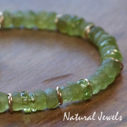 Een armband van 14K Goldfill met Peridot. Er zitten 2 soorten steentjes aan de streng, maar het is allemaal Peridot. De meesten zijn vrij grof geslepen, onregelmatig, het lijken wel brokjes. En ze zijn niet gepolijst, dus mat. Ertussen zitten dunne schijfjes van Peridot, verschillend van dikte en grootte maar wel gepolijst, zodat ze glimmen en het licht doorlaten. De tegenstelling tussen dat matte en die transparantie zorgt ervoor dat de armband een lust voor het oog is en natuurlijk helpen de gouden ringetjes die er tussen zitten, daar ook aan mee. Aan het gehamerde cirkeltje een klein brioletje van Peridot en een druppel van Olijfjade. De kraaltjes hebben een breedte van ongeveer 5 à 6 mm.
