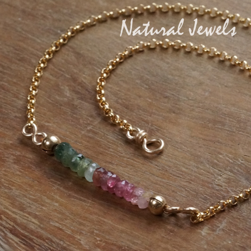 Een enkelbandje van 14K Goldfill met een klein rijtje Watermeloentoermalijntjes. Het stukje met de steentjes is maar klein, in totaal 2 cm breed. Het bandje sluit met een springslotje.