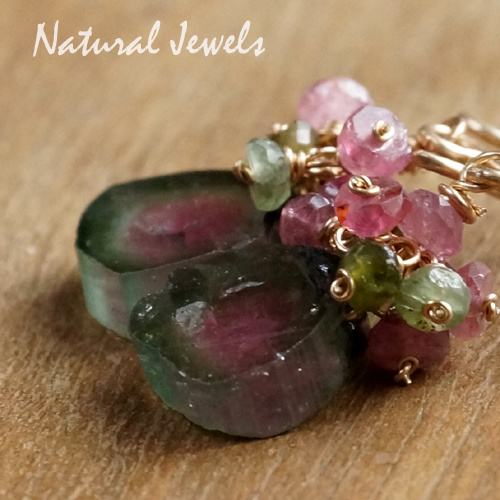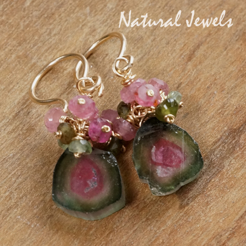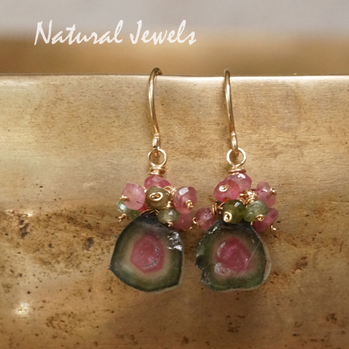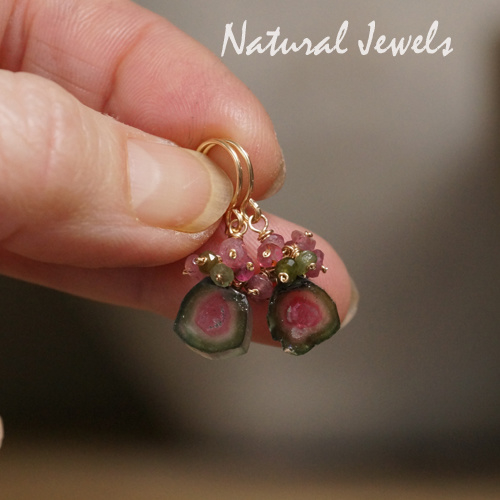 Toermalijn komt in vele kleuren voor en de kleurencombinatie van roze en groen in één steen en in deze vorm is zeldzaam. Je moet je voorstellen hoe deze Watermeloentoermalijn is gevormd: in een staafje, groen aan de buitenkant, met een roze kern en er zit een randje kleurloos tussen, echt zoals een watermeloen. En zo'n staafje wordt dan in kleine schijfjes gezaagd. Ik heb héél lang moeten zoeken op het internet voor ik deze mooie schijfjes vond, ze zijn namelijk nogal zeldzaam in zo'n perfekte kleurencombinatie. En toen ik ze vond, bij een verkoper in Pakistan, kon ik er niks mee omdat ze geen gaatje hadden. De handelaar boorde zelf geen kleine gaatjes in zijn stenen, maar nadat ik bereid was verschillende paren af te nemen, is hij op zoek gegaan naar iemand die dat voor hem kon doen. Toen duurde het nog heel lang voor ik ze in huis had, door het conflict met India wat momenteel weer een rol speelt, kon hij niets naar het buitenland versturen. En nu eindelijk zijn deze prachtige schijfjes Watermeloentoermalijn bezorgd en onmiddellijk heb ik een paar omgevormd tot deze vrouwelijke oorbelletjes.