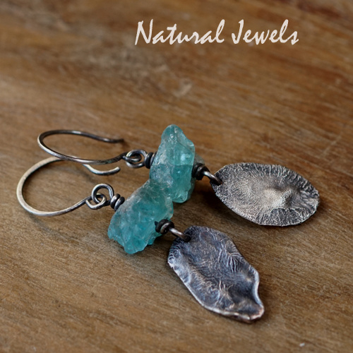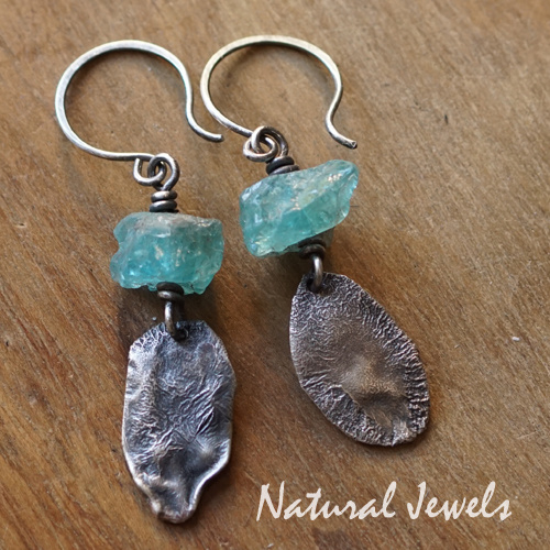 Oorbellen van Sterling zilver met een brokje Apatiet en daaronder een ovale vorm van gereticuleerd zilver. Alles hangt aan een ronde oorhaak.