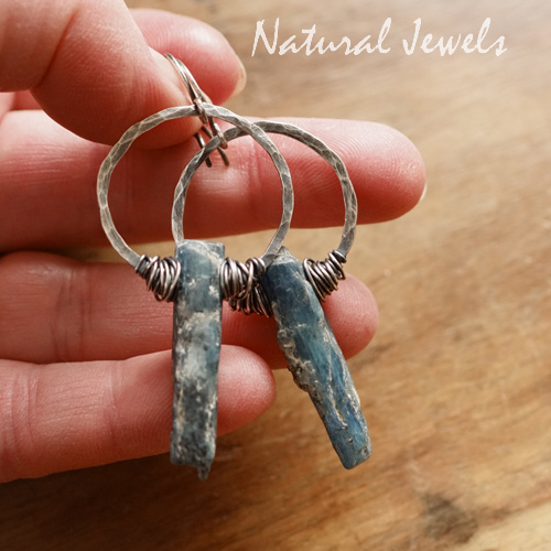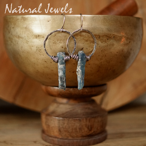 Oorbellen van Sterling zilver met Kyaniet. De oorbellen bestaan uit een onbewerkte staaf van Kyaniet aan een gehamerde cirkel van zilver. De stenen vertonen allerlei onregelmatigheden en o o o wat is dat toch mooi, zo'n stukje puur natuur verwerkt in een oorbel. Aan weerszijden heb ik een coconnetje van zilver gezet, waarmee de stenen in de cirkel zijn geplaatst. De cirkel is met de hand gehamerd zodat je de hamerslagen nog wat ziet zitten. Alles hangt aan een ronde oorhaak. Ik heb drie paar oorbellen gemaakt met deze rauwe staven Kyaniet en dit is het grootste paar.Prachtige puur natuur oorbellen en echt, nóg natuurlijker wordt het niet.
