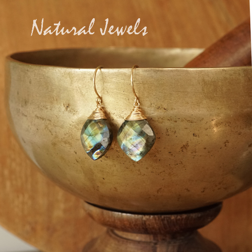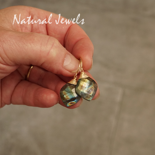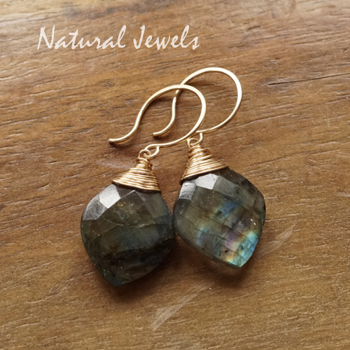Oorbellen van 14K Goldfill met een briolet van Labradoriet. Deze stenen zijn geslepen in een bladvorm en ze hebben faceten. En wat gebeurt er veel in deze Labradorieten!! Er zitten heel veel verschillende kleuren in zoals je op de foto's kunt zien, tot aan paars toe. Ik zeg er wel bij, dat je die kleuren een beetje op moet zoeken, ze zijn alleen te zien bij een bepaalde lichtinval, zoals bijna altijd het geval is met Labradoriet. Is de lichtinval niet juist, dan zijn het vrij donkere stenen. Ik vind dit een heel indrukwekkend paar en dat komt omdat er zoveel verschillende kleuren zitten in een betrekkelijk klein stuk steen, dat kom ik niet vaak tegen.