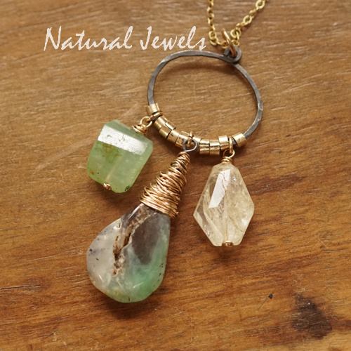Hanger blauwgroene steenCHRYSOPRAAS HANGEREen hanger van 14K Goldfill met een 3 verschillende edelstenen aan een liggende ovale vorm. De ovaal is van zwaar geoxideerd Sterling zilver, de hamerslagen zijn erin zichtbaar. Aan de ovaal hangen drie…